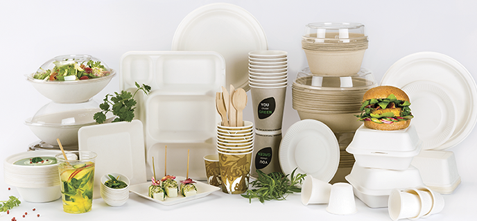 Vaisselle jetable biodégradable pour les professionnels et les particuliers : assiettes en pulpe de blé, en fibre de canne…, couverts en PLA, gobelets en carton…