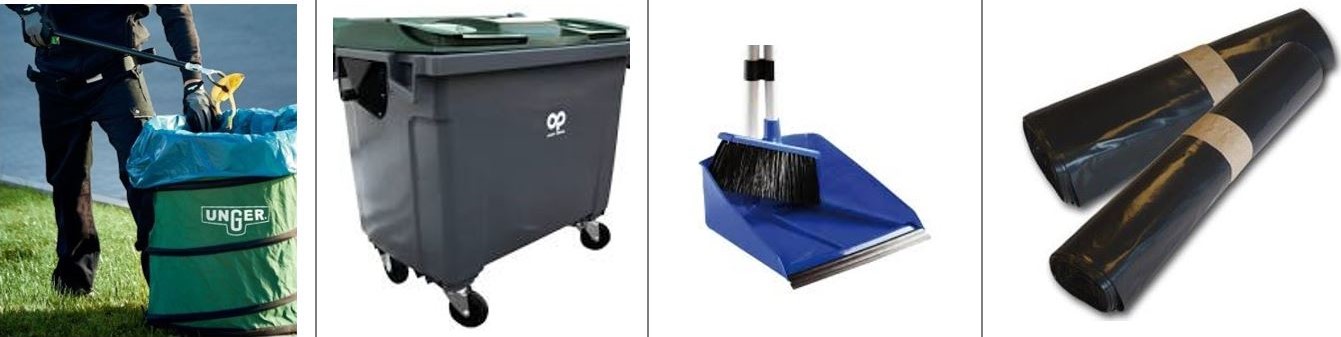 Pinces ramasse déchets, sacs aspirateurs, sacs poubelles, poubelles, chariot de voirie, containers, pelles : tout pour collecter les déchets.